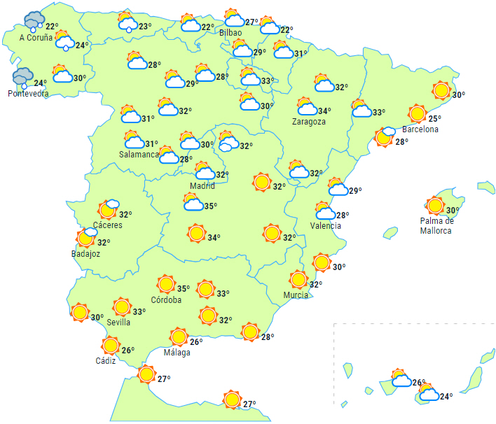 Der forventes stabilt vejr i det meste af landet med letskyet til klar himmel. Tilgangen til en Atlanterhavsfront vil dog øge skydækket over den nordvestlige del af halvøen, og det giver nedbør i dagens anden halvdel - særligt i den nordvestlige del af Galicien.