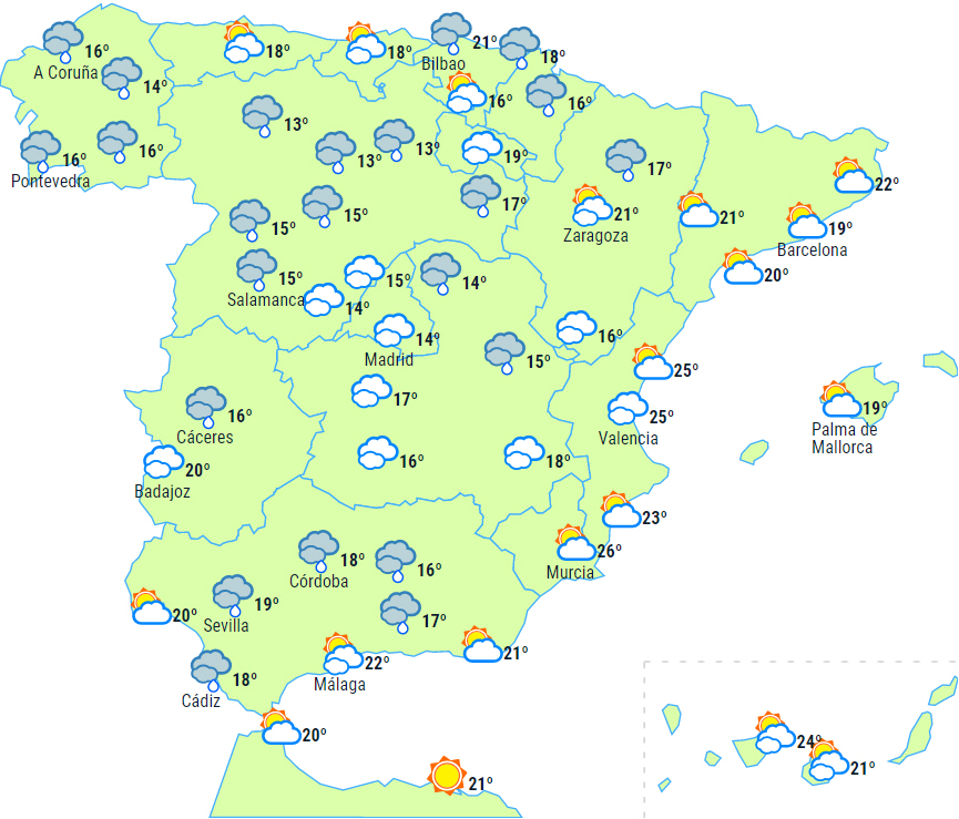 Skyet eller overskyet himmel over meget af den vestlige halvdel af halvøen, med let nedbør i det cantabriske område, den øvre Ebrodal, de vestlige og centrale Pyrenæer, den nordlige højslette, det vestlige af den sydlige højslette og Andalusien - mere intens nedbør i Galicien, hvor det lejlighedsvis kan blive ledsaget af torden og lokalt være kraftig og/eller vedvarende.