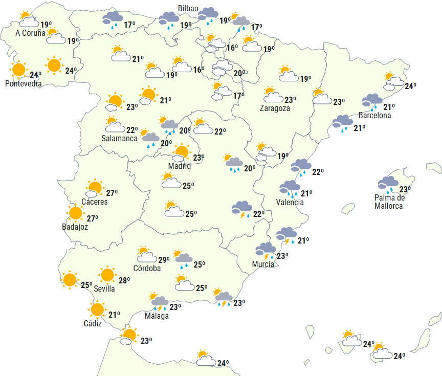 Klar himmel i dagens første timer, men mere overskyet i løbet af formiddagen. Sandsynlighed for lokalt kraftige byger ledsaget af torden om eftermiddagen, mere sandsynligt i den nordlige halvdel af provinsen. Temperaturer uden ændringer, bortset fra let stigning om natten på nordkysten. Det betyder 26 til 27 grader og 15 til 18 om natten.