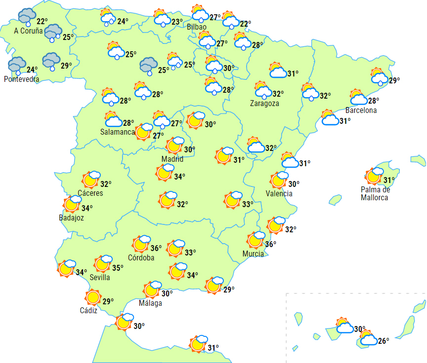 Temperaturerne har tendens til at stige på Atlanterhavssiden og ellers kun få ændringer i resten af landet. Det forventes, at vi kommer over 35 grader i dele af Murcia, Valencia og i Guadalquivir-dalen.