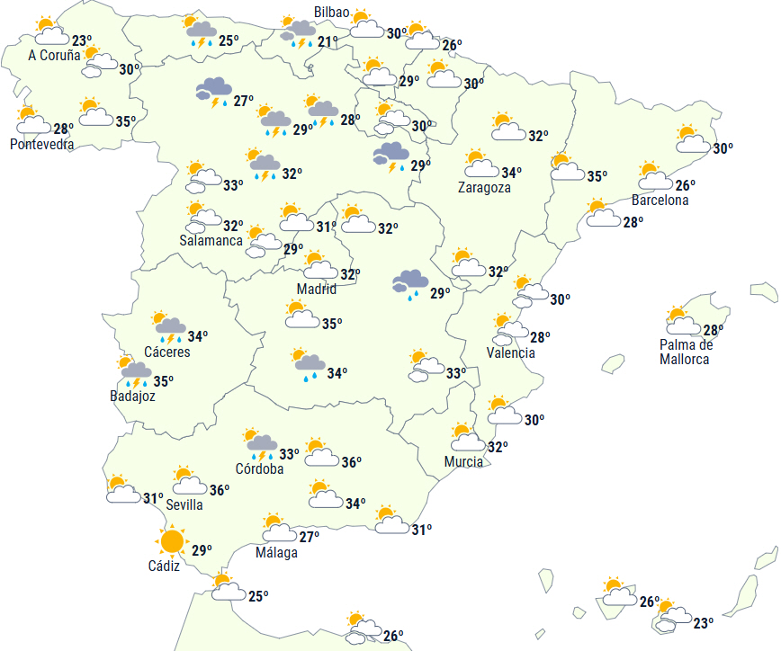 Dagstemperaturerne stiger moderat eller markant på den nordvestlige tredjedel og falder med tilsvarende styrke på den sydlige tredjedel. Vi overstiger 36 grader i store områder af halvøens sydlige indland og 38 grader i den øvre Guadalquivir-dal.