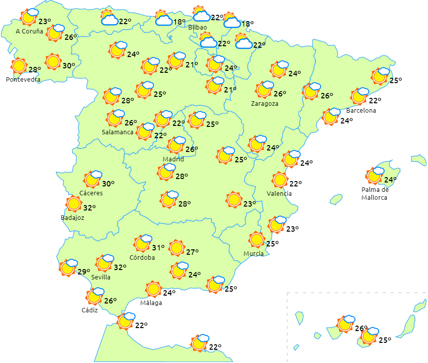 Overvejende letskyet eller klart vejr i hele landet med enkelte højtliggende skyer over den vestlige halvdel af halvøen. Der forventes kun nogle få lavthængende skyer om morgenen over det nordlige område samt lidt overskyet om eftermiddagen over Mallorca, den sydlige og østlige del af halvøen, i de centrale bjerge og over den nordvestlige del af Castilla y León.