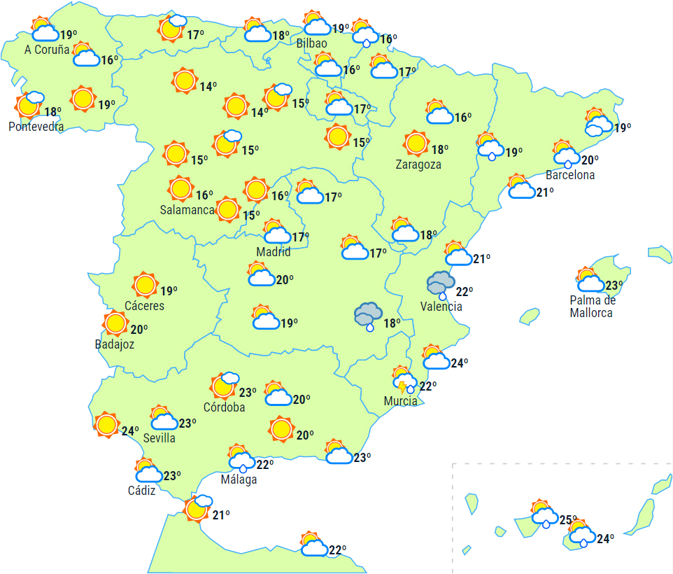 På grund af passagen af en Atlanterhavsfront forventes skyet eller overskyet vejr til det meste af halvøen med regn og lejlighedsvise tordenbyger, der lokalt kan være kraftige og vedvarende i det vestlige Andalusien og moderat i og omkring den vestlige del af de centrale bjerge og Extremadura.