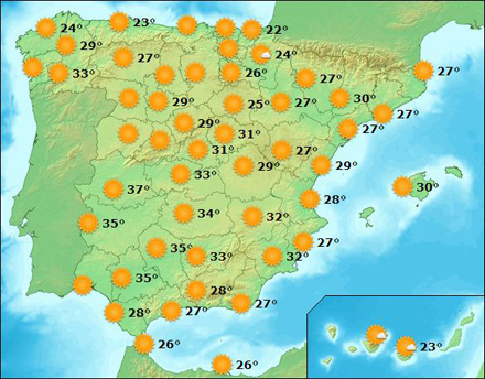 Den nordspanske kyst nyder godt af lave sommertemperaturer på mellem 22 og 26 grader, Midtspanien har omkring 30 – 35 grader, Sydspanien 35 grader, mens kysterne nøjes med 30 grader.