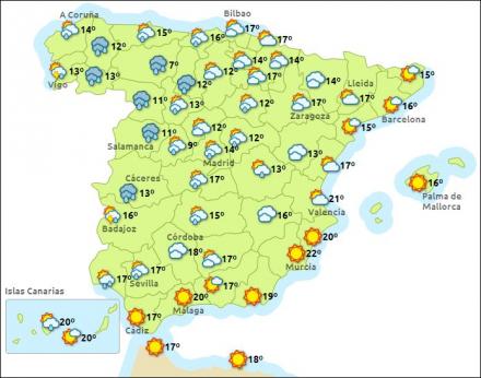 Provinserne Salamanca, Ávila og Huelva er i dag i gult beredskab på grund af regn, og det er skyet i den vestlige halvdel af landet. I morgen ryger Huelva op i orange beredskab på grund af udsigt til kraftig nedbør. Også den vestlige del af De Kanariske Øer er i gult beredskab på grund af blæst og høje bølger.