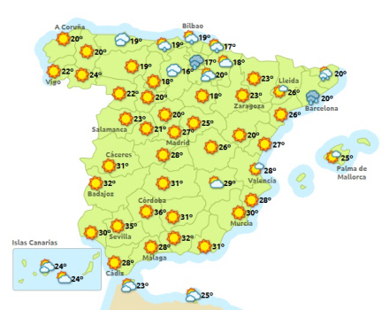 Madrid, solrigt, 14 – 27 grader, Barcelona skyet og byger, 18 – 24, Valencia, letskyet, 20 – 27, Málaga, sol, 21 – 31 grader.