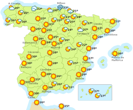 Hele landet har i dag mest solrigt med undtagelse af Pyrenærerne og De Kanariske Øer, som får mere skyet vejr.