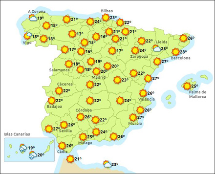 Vejr i Spanien, lørdag kl. 15:00