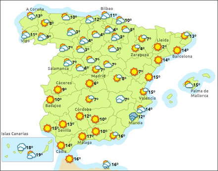 Der kommer nogen nedbør i de nordvestlige egne, langs Middelhavskysterne dog en del sol, mens Balearerne og Catalonien kan få enkelte byger, men midt på ugen bliver det mere skyet med regn og blæst. Efter juledagene kommer der nogen opklaring, men næste weekend byder på et nyt lavtryk med mere af samme våde skuffe.