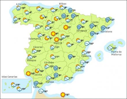 Costa Brava får i dag overskyet vejr, og der kommer også en del regn med mellem otte og 11 grader. Søndag morgen klarer det til gengæld op, det bliver stille vejr med sol fra en nogenlunde klar himmel. Mandag igen mere skyet, og vinden frisker op, tirsdag en overgang klart, men i løbet af natten blæsende. Onsdag op til kuling fra sydvest, men solrigt og med uændrede temperaturer. Torsdag og fredag sol og op til 14 grader. Sidst på ugen igen mere blæsende, men tørt.