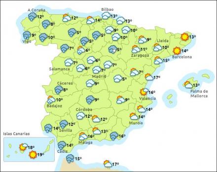 Costa Blanca får i dag mest tørt vejr, og der også kommer nogen sol. I løbet af eftermiddagen blæser det op fra sydvest, og i nat bliver det mere skyet. I morgen regn de fleste steder og mellem ni og 16 grader. Natten til mandag bliver det rigtigt blæsende med op til kuling, men vinden lægger sig i løbet af eftermiddagen, og der kommer også nogen sol. Tirsdag solrigt og let til frisk vind. Onsdag blæsende med op til kuling, men fortsat tørt og solrigt. Efterhånden let stigende temperaturer, og det solrige vejr fortsætter resten af ugen.