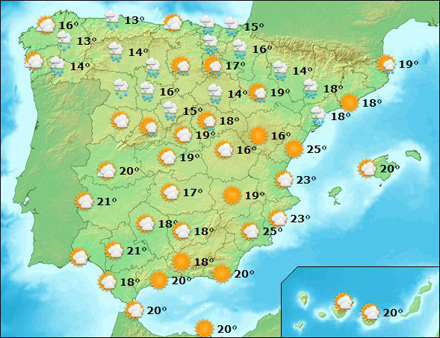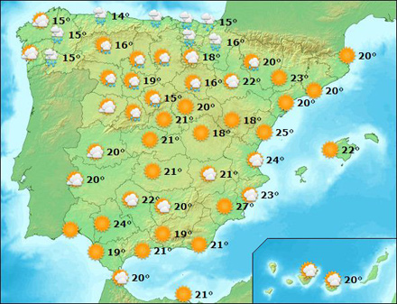 Vejr i Spanien, lørdag kl. 15:00