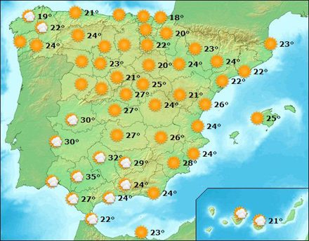 På Costa del Sol når termometret i løbet af den næste uges tid end ikke op i nærheden af 30 grader, og det er ret usædvanligt for denne tid på året. Det bliver til gengæld ret solrigt og tørt med svag vind fra skiftende retning. I dag nogen sol og mellem 18 og 24 grader med vind fra østlig retning. I morgen lidt lunere med dagtemperaturer på op til 26 grader. Resten af ugen stort set uændret.