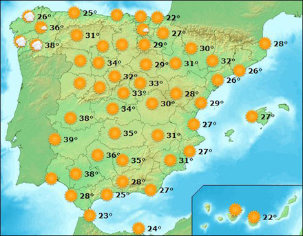 Derimod ser Middelhavskysterne og de nordlige egne ud til at gå fri af den hedebølge, der især har ramt de vestlige dele af landet. Både Costa del Sol og Costa Blanca nøjes med op til 30 graders varme, men sidst på uge bliver det varmere, så der er altså al mulig grund til at finde både solcreme og parasol frem.