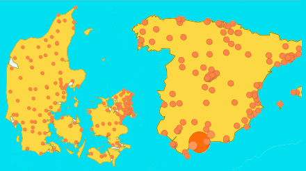 Kortene over Danmark og Spanien viser, hvor læserne bor