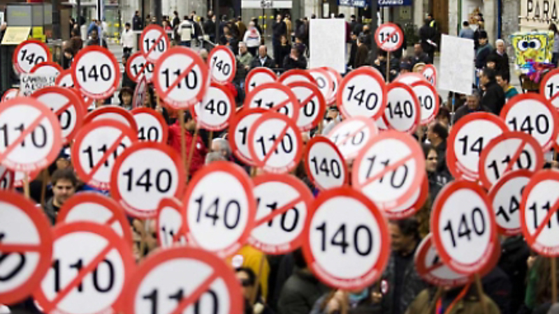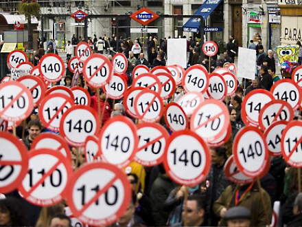 Foreningen Plataforma Movimiento 140 kræver, at den tilladte fart øges til 140 km/t. Under kampråb som: 'Nej til 110 km/t' og 'I 70-erne kørte min bedstefar 143 km/t' protesterede deltagerne mod den ny lov, som har til formål at begrænse afhængigheden af olie ved at sænke energiforbruget.