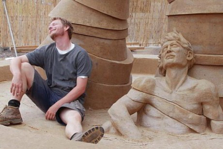 Julekrybbe i sand er så flot, at man skulle tro, at den var hugget i sten - i hvert fald ligner det ikke noget så porøst som sand. Seks mand står i front for mega-sandslottet, og en af dem er dansker.
