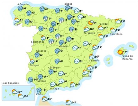 I hovedstadsregionen Madrid er der varsel om sne. Der ventes op til seks centimeter sne i bjergene omkring Madrid og mellem to og seks centimeter sne i Henares og Vegas samt i de sydlige og vestlige egne. Snevejret ventes at aftage i løbet af eftermiddagen.