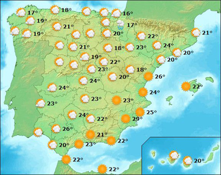 Termometret måler i dag mellem 12 – 24 grader i Madrid, Barcelona 14 – 24, og i Valencia og Málaga 17 – 27 grader.