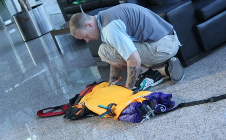 Faldskærmen pakkes grundigt (billedet er fra et hop fra hotel El Bali)