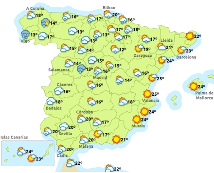 Valencia får i dag pænt meget sol, og det bliver tørt, men i løbet af eftermiddagen kommer der flere skyer på himmelen. I nat overskyet og kraftig nedbør, som fortsætter til morgen middag, hvorefter der kommer opklaring. Mellem 15 og 20 grader.