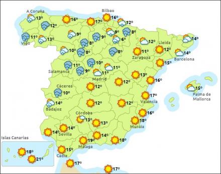 Madrid har i dag letskyet vejr med fem – 12 grader, Barcelona letskyet og mellem otte – 17 grader, Valencia mest solrigt med tre – 19 grader, og endelig Málaga med fint og solrigt vejr og mellem ti – 19 grader.