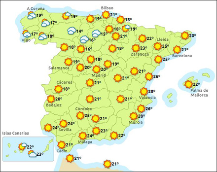 Madrid får i dag letskyet vejr med mellem 10 – 22 grader, Barcelona letskyet og 15 – 22 grader, Valencia skyfrit med mellem 17 – 28 grader og Málaga skyfrit med 16 - 25 grader.