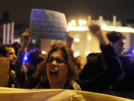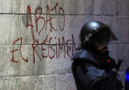 Anholdelserne skete efter, at en gruppe unge var brudt gennem politiets afspærringer op til Kongressen i Madrid og med store bogstaver havde malet: 'Ned med regimet' ved foden af en af de store løve-bronzestatuer ved hovedindgangen til kongressen.