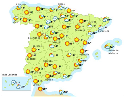 Madrid får i dag skyfrit, men noget køligt vejr med mellem 9 – 16 grader, Barcelona solrigt og mellem 12 – 20, Valencia letskyet og mellem 9 – 20 grader og Málaga letskyet og mellem 13 – 21 grader.