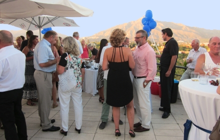 Pladsen uden for kontoret i Nueva Andalucia var i dagens anledning dekoreret med blå balloner, og der var sat borde op med parasoller for at tage den værste eftermiddagssol.