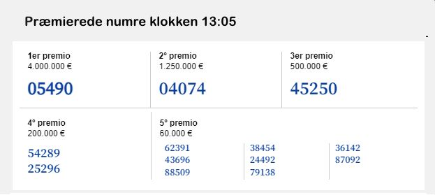 Den samlede præmiesum er på 2,52 milliarder euro, der fordeles mellem de 172 udstedte “Decimos”. Der er 180 serier hver med 100.000 numre, der hver er delt i tiendedele, der kaldes Decimos.