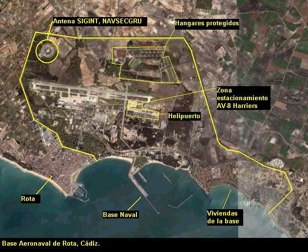 Rota-basen dækker et areal på mere end 2.400 hektar Havnen har tre moler på i alt 2.400 løbende meter og en militær flyveplads med en landingsbane på 3.700 meter. Der er også i øjeblikket det største ammunitionsdepot på det europæiske kontinent.
