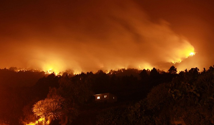 Brandslukningsarbejdet er vanskeliggjort af høje temperaturer og voldsom blæst i området, og man frygter, at ilden "springer op over bjerget" og når frem til beboede områder den anden side af øen.