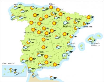 15 provinser i den indre del af landet, nemlig Cantabrien, Ciudad Real, Cuenca, Guadalajara, Toledo, Ávila, León, Palencia, Salamanca, Segovia, Soria, Valladolid, Zamora, Madrid og Ourense, er i gult beredskab på grund af lave temperaturer og tåge. Her er sigtbarheden nu nede på 100 meter, og der er varsel om frost med helt ned til minus seks grader.