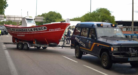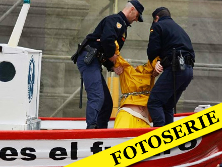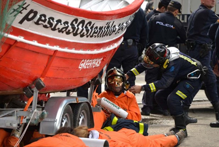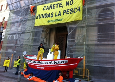 Aktivisterne havde sat et kæmpe skilt op med ”Cañete, sænk ikke fiskeindustrien”, rettet mod Spaniens landbrugsminister, Miguel Arias Cañete.