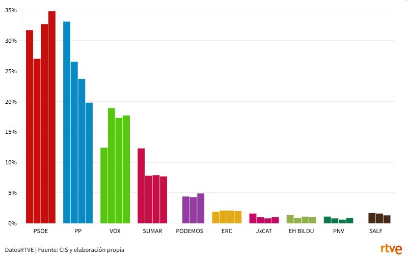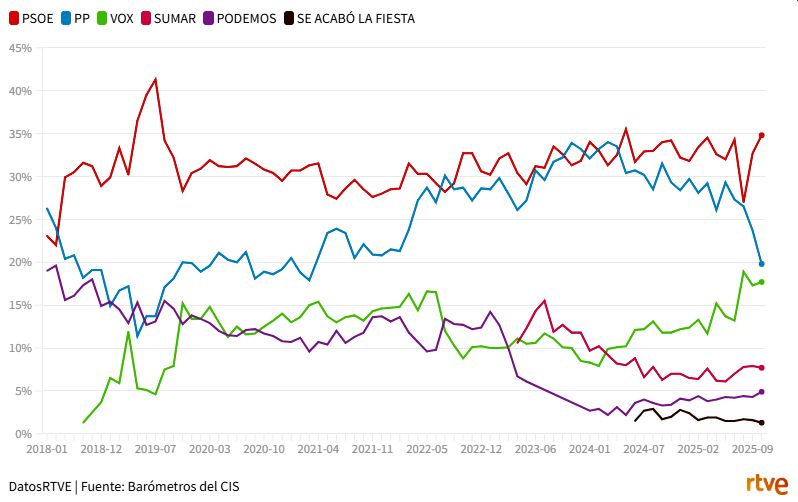Ifølge CIS's seneste vurderinger ville PSOE have vendt deres politiske situation markant siden sommeren. Efter at være styrtdykket syv procentpoint i juli på grund af afsløringerne i 'Cerdán-sagen' og nået ned på et statistisk uafgjort med PP, ville de ikke kun have genvundet deres tidligere niveau, men også være tæt på deres rekord i denne valgperiode. I den sidste måned ville de være vokset med yderligere 2,1 procentpoint, efter at have skudt i vejret med ni procentpoint i september. På sin side ville PP være styrtdykket næsten syv procentpoint på to måneder (3,5 point af dette fald er siden september). Vox stiger fire procentpoint siden september og forbliver på deres højeste niveau siden 2019.
