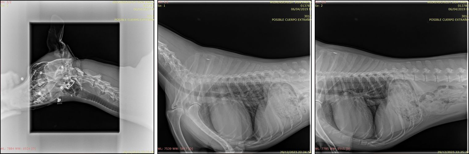 En dyrlæge gik straks i gang med et stetoskop og et termometer, mens en anden registrerede Don Pablo og ejerforholdet. Efter kort tid kom en anden dyrlæge. Vi fortalte om situationen, havde taget en tilsvarende kniv med, og hun tog Don Pablo med til røntgen uden protester fra ham.