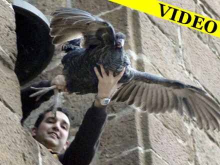Så hvert år går en af byens indbyggere op i klokke-spiret på den lokale Santa María de la Magdalena-kirke og kaster påfuglen ud.