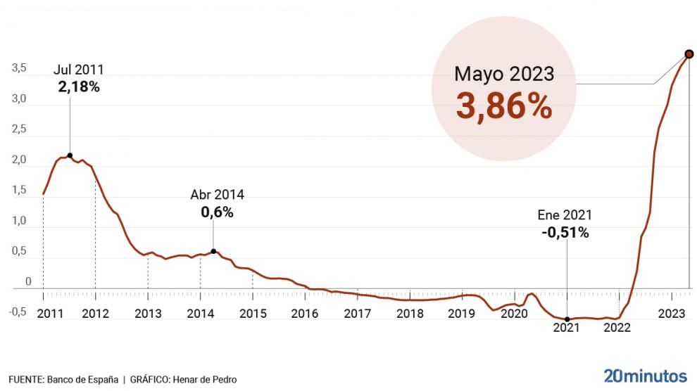 Et gennemsnitligt boliglån på 140.000 euro med en løbetid på 25 år med variabel rente, der i juni sidste år blev optaget med en Euribor på 1 procent, har nu en månedlig ydelse på 821,24 euro om måneden. Det vil sige 550 euro ekstra hver måned - eller 3.175 euro om året - i forhold til juni sidste år.