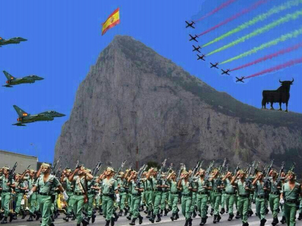 Billedet er stykket sammen af forskellige lånte elementer, men viser den spanske legion marchere foran den berømte klippe i Gibraltar, hvor der på toppen er hejst et spansk flag.