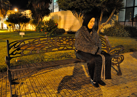 Ayas mor på en bænk udenfor hospitalet