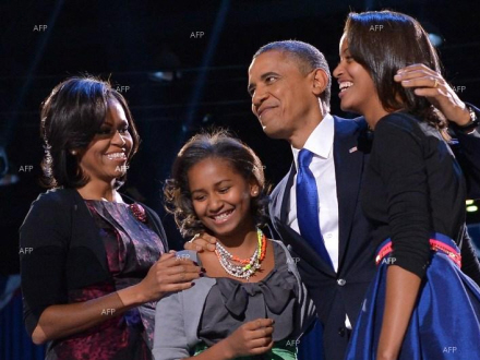 Barack Obama startede sin sejrstale med Michelle og døtrene Natasha Lynn og Malia Ann på scenen