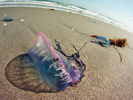 Selv når goplerne skyller ind på land, kan de stadig være giftige, hvis man kommer i berøring med dem. Ved allergiske tilfælde skal man omgående søge lægehjælp.
