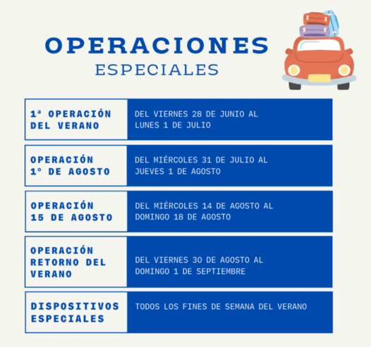 Af denne grund og for at imødekomme det større antal mennesker, der starter deres ferie i weekenden, og som vælger bilen som transportmiddel, har DGT oprettet særlige trafikregulerings- og kontrolanordninger for alle weekender i sommerperioden og intensiveret dem i de første weekender i hver måned på grund af de såkaldte ud- og hjemrejseoperationer.