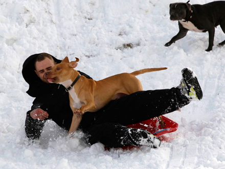 En mand bliver slået af sin kælk af en meget energisk og legesyg hund i Newtown Linford, England