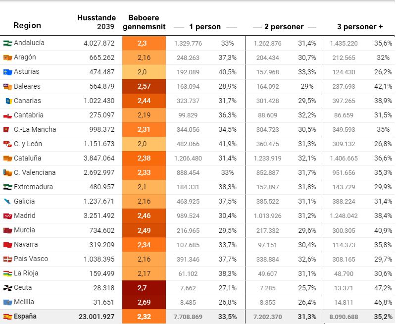 INE anslår, at antallet af husstande vil stige i alle regioner mellem 2024 og 2039. Relativt set vil husstandsstørrelsen stige mest i Murcia-regionen med 28,8 procent, i Valencia-regionen med 25,8 procent og i Catalonien med 22,9 procent.