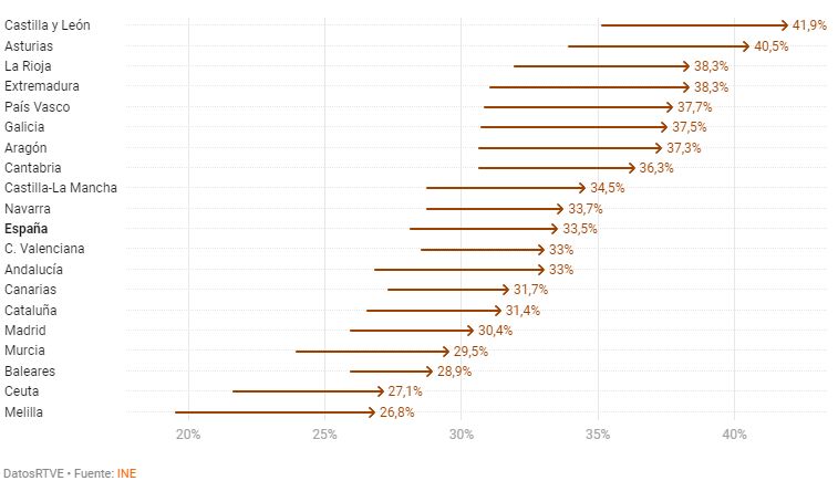 Castilla y León vil ligge på førstepladsen med flest husstande med én person, nemlig 41,9 procent af det samlede antal i 2039. Asturien følger efter med 40,5 procent, og på tredjepladsen kommer Extremadura med 38,3 procent. På den anden side er Melilla og Ceuta de autonome byer med færrest mennesker, der bor alene, henholdsvis 26,8 procent og 27,1 procent. Inden da kommer Balearerne med 28,9 procent, Murcia Regionen med 29,5 procent og Madrid Regionen med 30,4 procent.