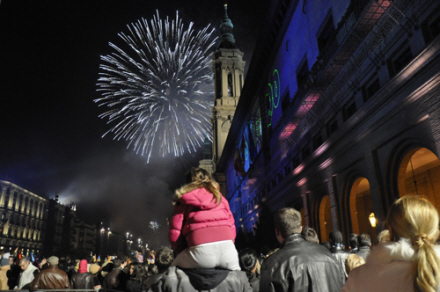 Alle aldre fejrer det nye år - her på Plaza del Pilar i Zaragoza