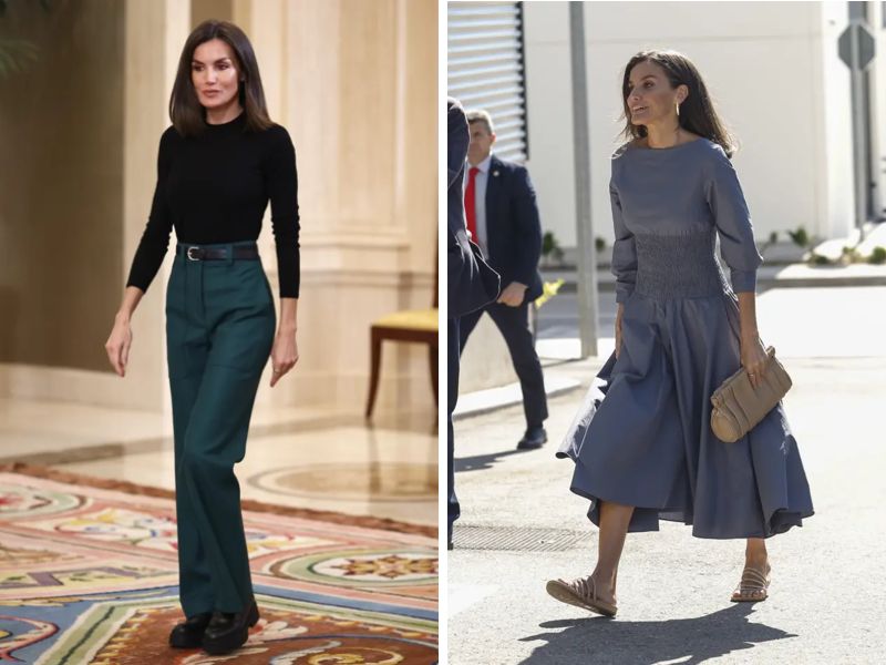 Letizia havde valgt et mere uformelt outfit, men uden at miste sin klassiske og tidløse stil. Et par smaragdgrønne højtaljede bukser fra Hugo Boss med ‘hvepsetalje-effekt’ kombineret med en sort finstrikket trøje.