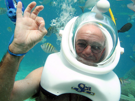 Tidligere var Sea-Life-akvariet i Manchester det eneste sted i Europa, man kunne prøve den lidt fjollede hjelm, der nok mest ligner den øverste del af en rumdragt.